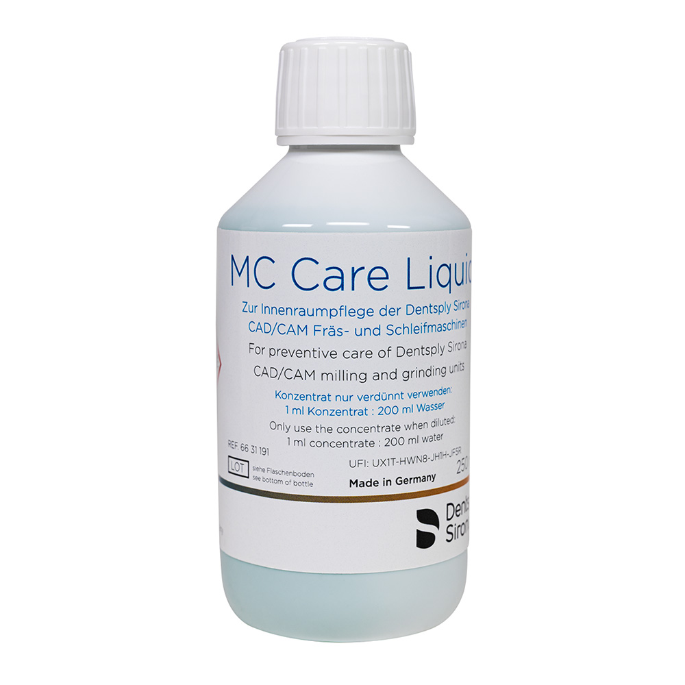 MC Care Liquid er et forebyggende pleje- og rengøringskoncentrat til brug i vådrengøringsprocessen for alle Dentsply Sirona slibe- og fræsemaskiner. Ud over rengøringsfunktionen har væsken også en plejende effekt. Den skaber en vandafvisende effekt og har en let afkalkende virkning. Hvis MC Care Liquid anvendes ved hver vådrengøring, kan forurening i bearbejdningskammeret, i slangesystemet og ved dyserne reduceres betydeligt.